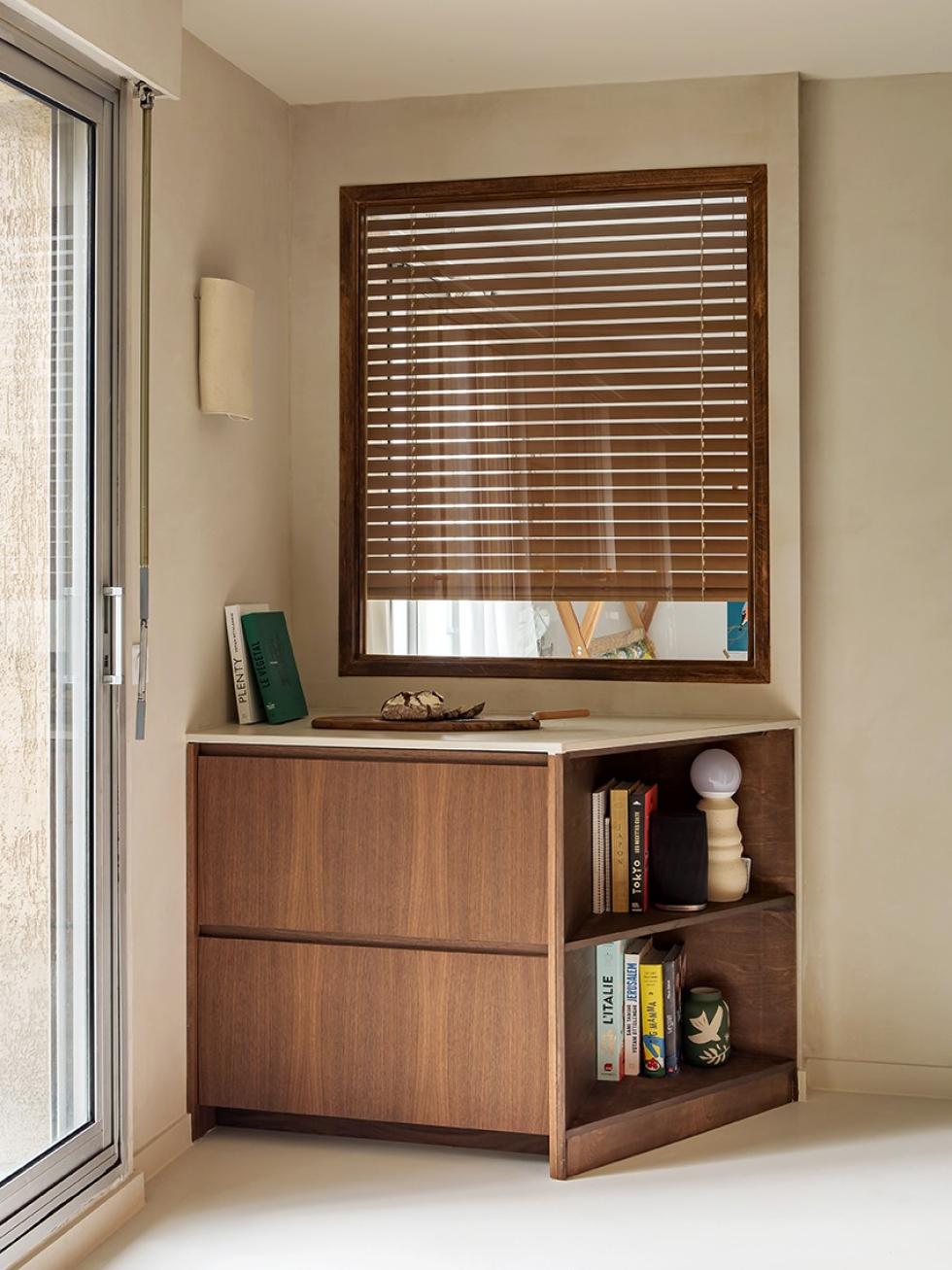 Die Unterschränke hingegen sind mit natürlichem Walnussholz verkleidet und durch Zwischenlagen aus Deckplatten getrennt, die für Rhythmus sorgen und die Japandi-Atmosphäre schaffen, die dem Keramiker am Herzen liegt. Die gleiche Holzart findet sich auch im Wohnzimmer sowie auf den Regalen im Essbereich wieder, die natürliche Schatullen für Corentins Arbeit sind
