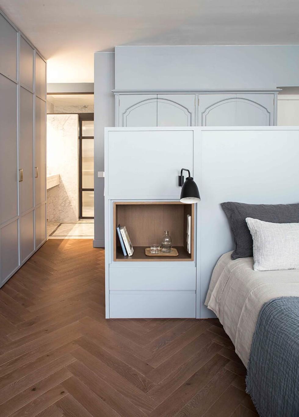 Die Stärke dieses Designs, das von der in Barcelona ansässigen Agentur Espacio en Blanco entworfen wurde? Es ist Kopfteil, Nachttisch und Stauraum in einem. Ein genialer 3-in-1-Effekt, der das Raumvolumen strukturiert und den Schlafbereich abgrenzt, ohne ihn zu schließen. Wenn auch Sie schon immer davon geträumt haben, in der Mitte Ihres Schlafzimmers zu schlafen, dann ist jetzt der Zeitpunkt gekommen, es zu wagen. In der Sprache von Plum Living bedeutet diese maßgefertigte Inspiration: einige Ikea-Korpusse, unsere Verkleidungen in “Ciel voilé” für die Struktur und Deckseiten in Eiche Natur. Was für eine Kombi!