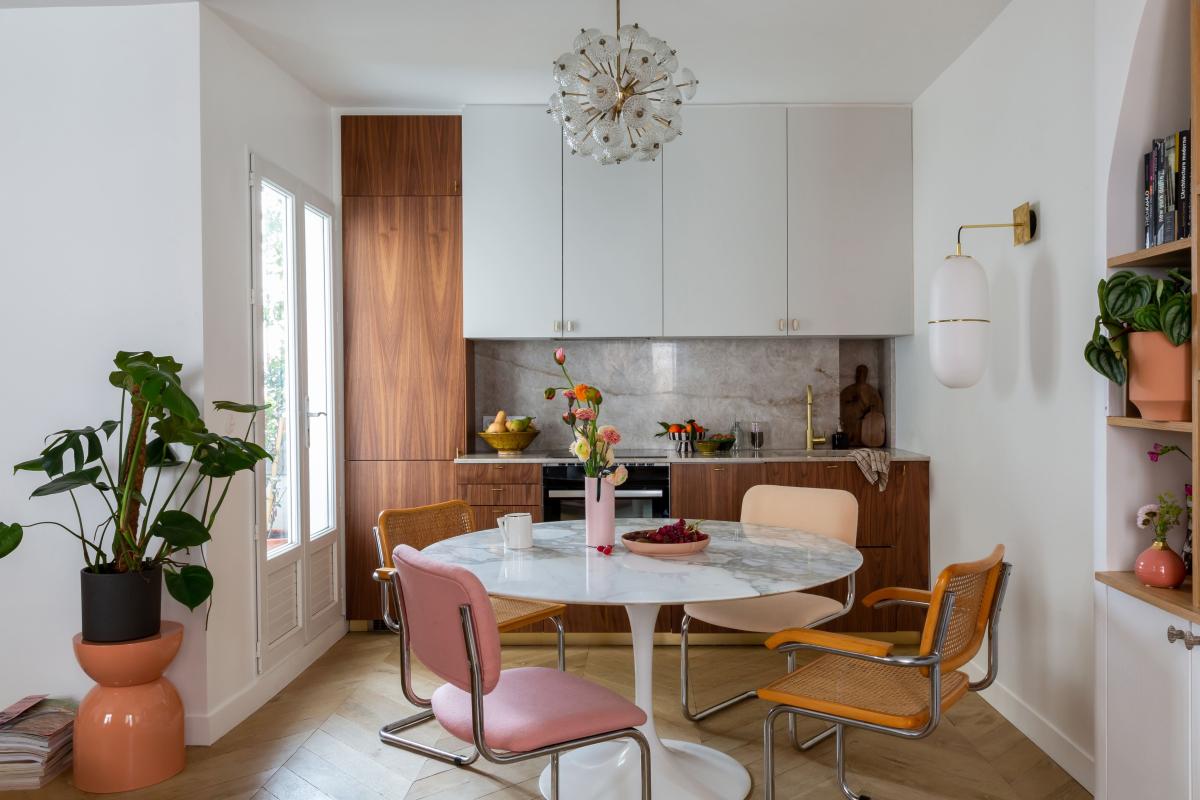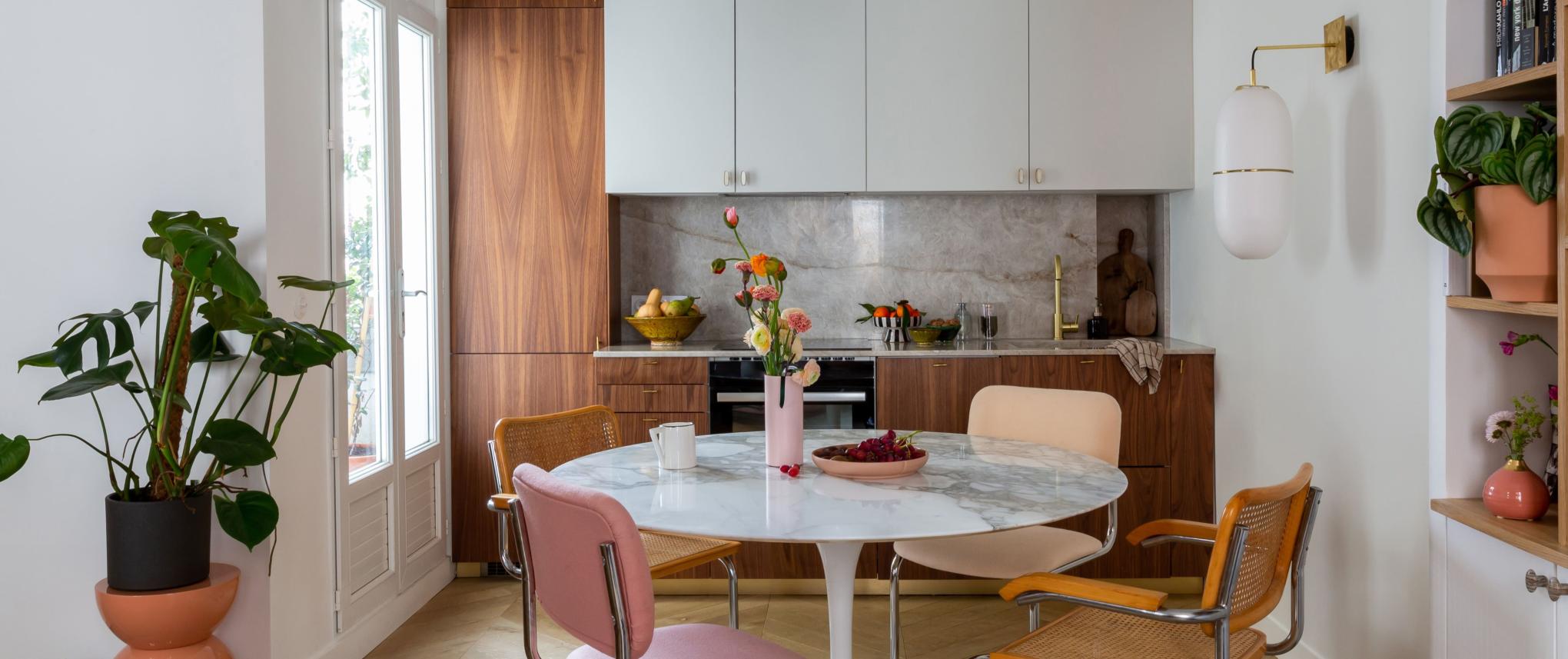 Fronten in Walnuss Natur, Griffe aus Perlmutt und Messing und eine Arbeitsplatte aus rosa Granit: Die Küche der Innenarchitektin Margaux Meza steht stolz zu ihren Vintage-Einflüssen. Die Mitbegründerin der Agentur Transition Id spielte mit den Limitierungen des Raumes und entschied sich dafür, das dunkle Holz optisch aufzuhellen, indem sie es mit einem blassen Grau kombinierte, das unserem “Grau 01 - Gris nuage” ähnelt. Das Ergebnis ist eine Küche, die mit dem Rest der Wohnung harmoniert und gleichzeitig perfekt mit dem Wohnzimmer verschmilzt.