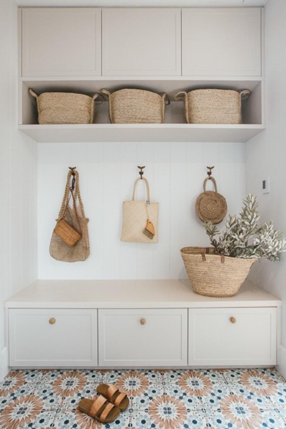 Es gibt unzählige Hauseingänge, die einen eher direkt zur Umkehr drängen. Sabine Mérillon schafft mit diesem warmen, offenen Flur genau den entgegengesetzten Effekt. Auf der einen Seite spendet der Pax-Kleiderschrank Platz für Mäntel, Jacken und andere Accessoires. Auf der anderen Seite fungiert eine zugeschnittene Deckseite als schwebendes Regal, das mit Pflanzen, Vasen und Körben für Gemütlichkeit sorgt. Die Wandverkleidung und die Wand selbst sind im Farbton “Moka” gestrichen, um den Raum visuell zusammenzuhalten. Willkommen in Ihrem Zuhause.