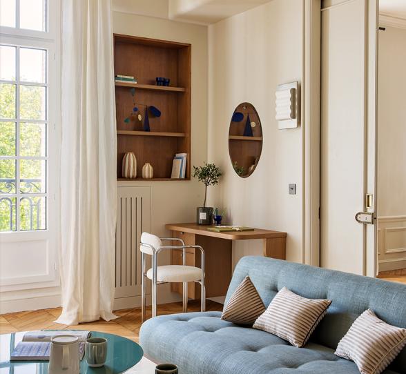 Der gemeinsame Nenner zwischen dem kleinen Schreibtisch, den Griffen und dem offenen Fach in diesem Kleiderschrank? Natürliches Holz. Wie fehlende Puzzleteile schaffen die übergroßen Griffe eine Verbindung zwischen den lackierten Fronten und den Eiche-Elementen. So wird Nützliches mit Ästhetik vereint und die Harmonie des Gesamtdesigns betont.