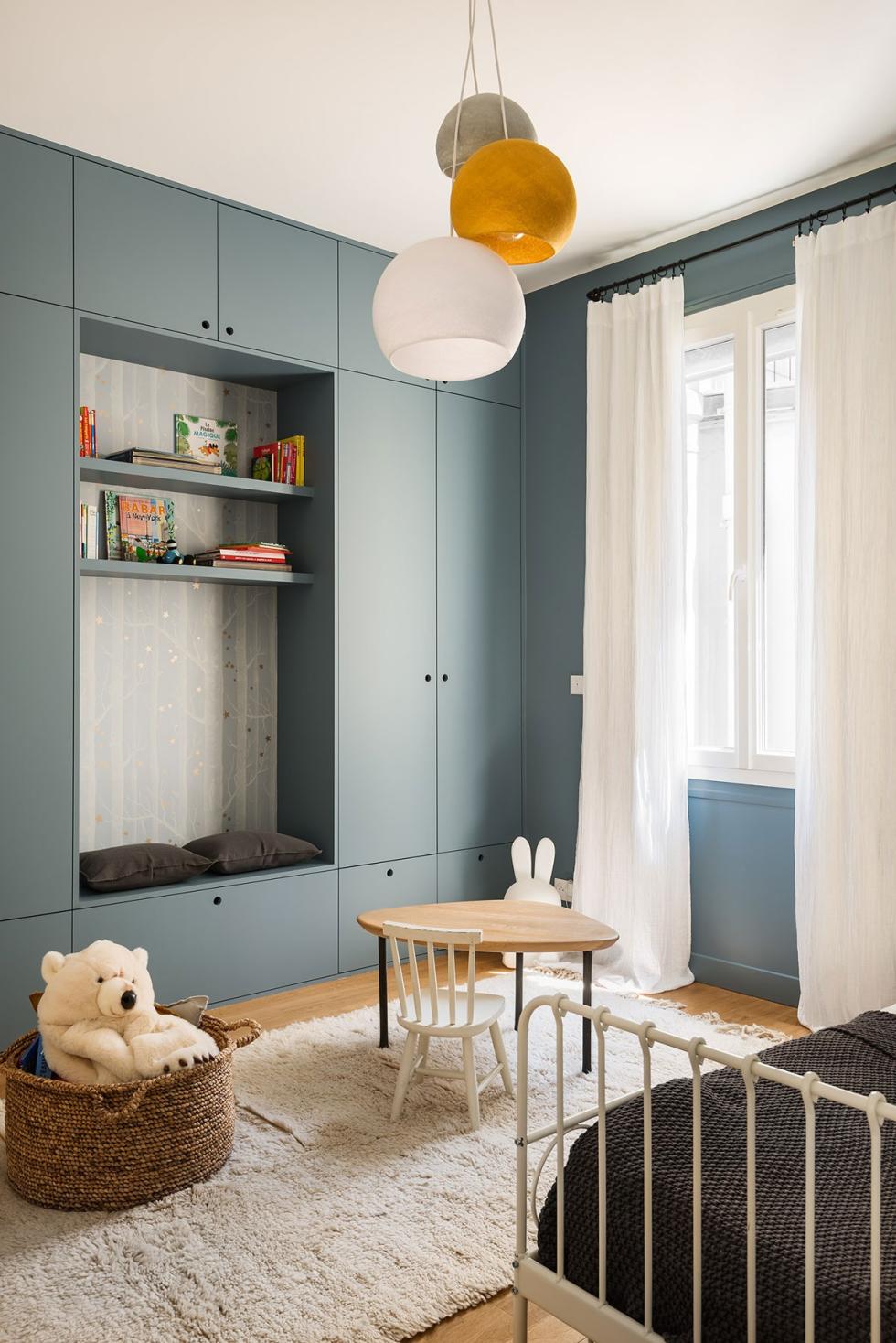 Ein beruhigendes Blaugrau, weiche Kissen und eine Tapete wie aus einem Märchen: Die Innenarchitektin Caroline Debono hat einen Kleiderschrank für Kinder entworfen, in dem sich eine Leseecke befindet, die zum Faulenzen einlädt. Die Sitzbank, die vom Tischler auf Maß gefertigt wurde, verbirgt eine große Schublade, die für die Aufbewahrung von Spielzeug und Kleidung perfekt geeignet ist. Eine tolle Inspirationsquelle für eine Einrichtung von Plum Living x Ikea, die diesem Projekt garantiert sehr nahe kommen wird. Sie lässt sich übrigens auch sehr schön als Erwachsenenversion abwandeln.