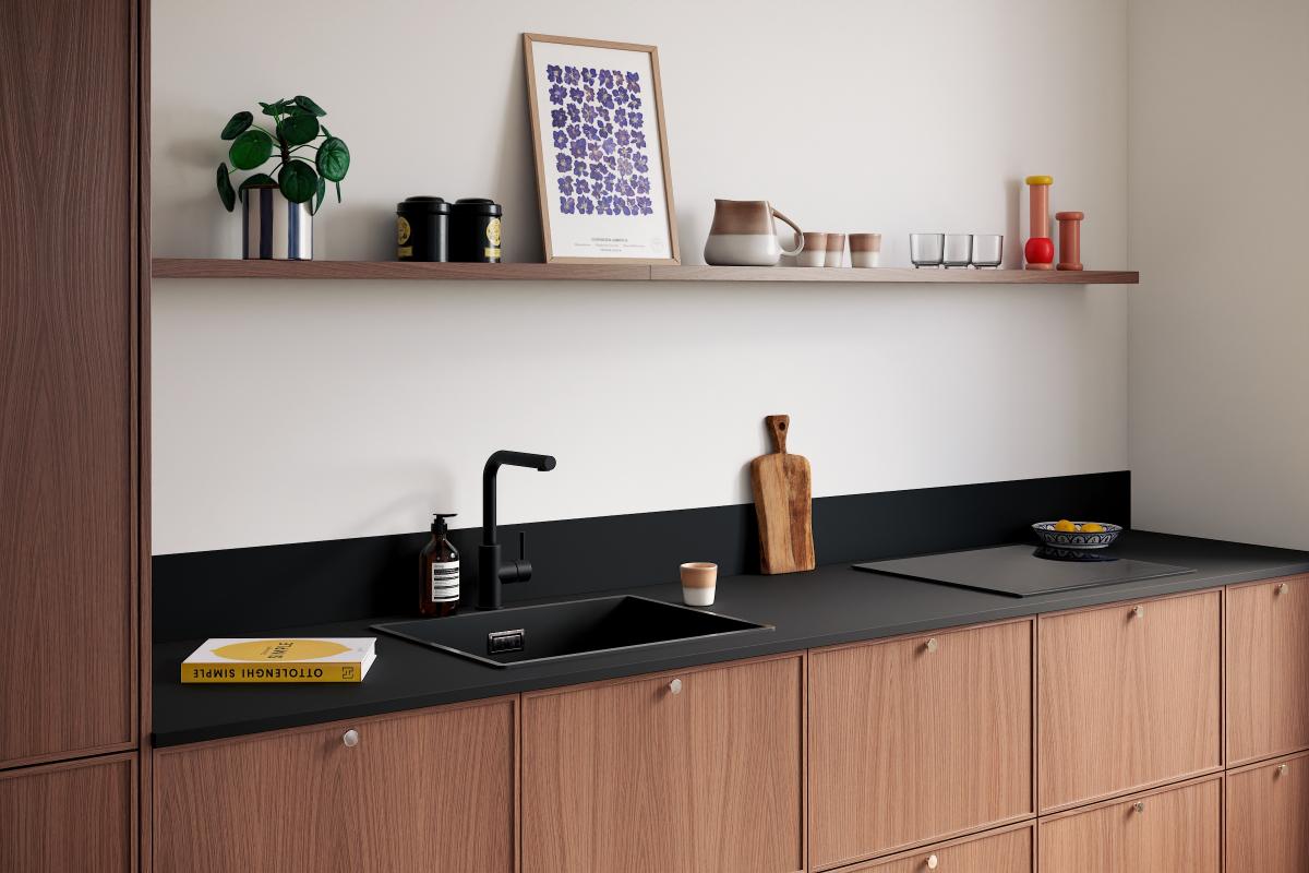 Muster einer Arbeitsplatte aus tiefschwarzem Laminat, ähnelt Pfirsichhaut oder Fenix.