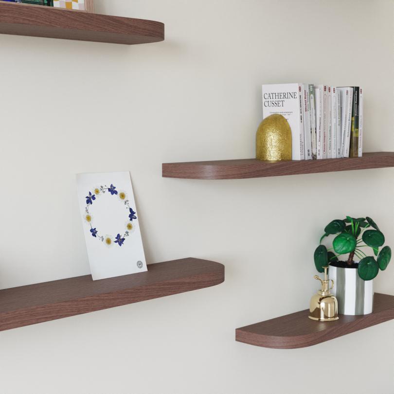 Schwebendes Wandregal mit unsichtbaren Befestigungen, mit einer rechten Ecke auf der einen Seite und einer abgerundeten Ecke auf der anderen (Radius von 15 cm).