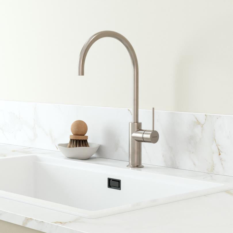 Massives Messing, mit einer sehr widerstandsfähigen Beschichtung aus gebürstetem Nickel, beständig gegen Abnutzung, Kratzer und Oxidation. Keramikkartusche.