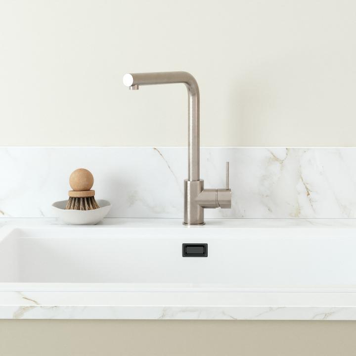 Massives Messing, mit einer sehr widerstandsfähigen Beschichtung aus gebürstetem Nickel, beständig gegen Abnutzung, Kratzer und Oxidation. Keramikkartusche.