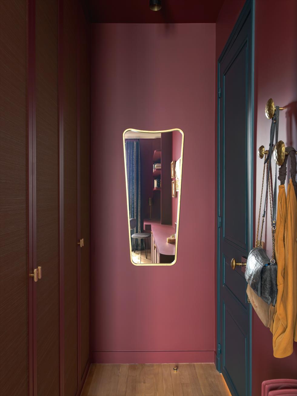 Si le blanc est anecdotique chez Caroline, c’est aussi le cas du noir ! Ici une tringle à rideaux, là une applique ou une console, héritée de la première mouture de l’appartement, et basta. La fondatrice d’Atelier CVD lui préfère des teintes profondes, comme le bleu canard ou le lie de vin, qu’elle utilise comme des accents, tantôt pour donner de l’allure à une fenêtre, tantôt pour twister une verrière. Une seule condition : qu’elles soient issues, elles aussi, de la palette du papier peint du salon, pour mieux faire le lien entre les autres nuances.