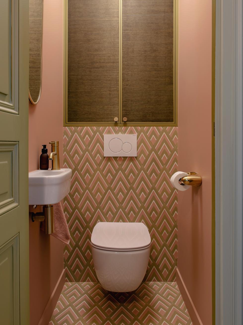 Papier peint Pierre Frey souligné par un miroir terre brûlée, murs céladon et verrières bleu canard : l’entrée annonce la couleur sans équivoque. Avec leur porte bronze et leurs carreaux blush, les toilettes qui s’y cachent ne sont pas en reste. C’est d’ailleurs de ce petit coin qu’est née l’idée de donner une seconde jeunesse à l’appartement. “J’ai rénové celui de mes voisins du dessus, ce qui m’a permis de réaliser qu’on pouvait nous aussi créer un second WC, indispensable quand vous cohabitez avec trois ados !” Un prétexte tout trouvé, dans lequel Caroline s’est engouffrée pour assouvir ses envies de changement. Exit murs immaculés, menuiseries virginales et canapés black & white. “J’ai compris que la couleur me faisait du bien”.