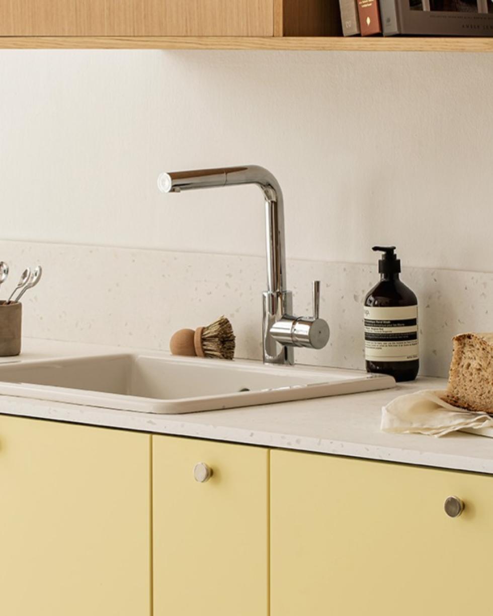Une ligne contemporaine, des finitions qui soulignent sa modernité et une douchette ultra-pratique cachée dans son bec : Line s’est fait instantanément une place au palmarès de nos accessoires favoris. Version noir mat, chrome ou laiton, il est l’allié des façades U-Shape et des éviers sous plan.