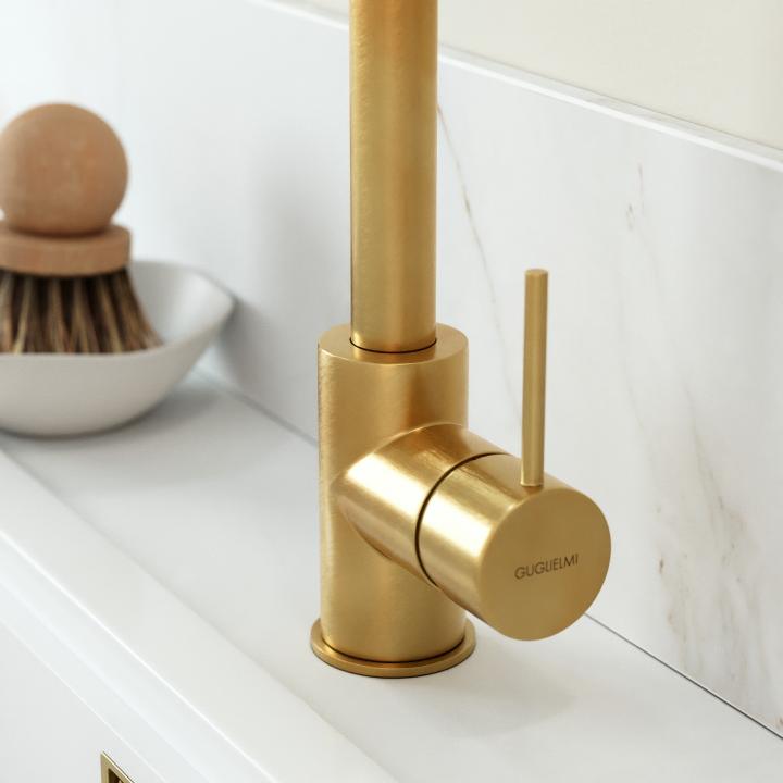 Laiton massif, revêtement or brossé galvanique très résistant à l'usure, aux rayures et à l'oxydation. Cartouche en céramique.