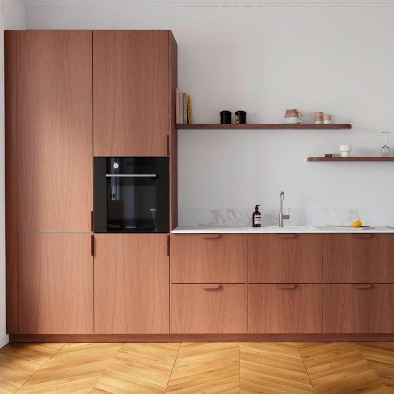 Une longue étagère file au dessus du plan de travail, exposant les objets que vous aimez.